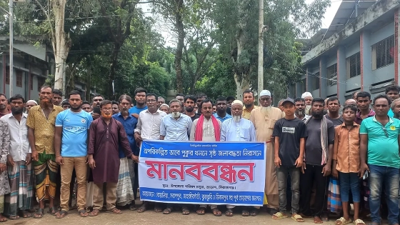 সিরাজগঞ্জের তাড়াশে অপরিকল্পিতভাবে অবৈধ পুকুর খননে সৃষ্ট জলাবদ্ধতায় তলিয়ে থাকা প্রায় তিন হাজার বিঘা ফসলি জমির জলাবদ্ধতা নিরসনের দাবিতে বিক্ষোভ ও মানববন্ধন করেছে এলাকাবাসী।