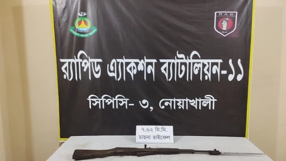 নোয়াখালীতে একটি চায়না রাইফেল পরিত্যক্ত অবস্থায় উদ্ধার করেছে র্যাব-১১। সোমবার (৩০ সেপ্টেম্বর) রাত সাড়ে ১২টার দিকে এক প্রেস বিজ্ঞপ্তিতে বিষয়টি নিশ্চিত করেছেন র্যাব-১১-এর নোয়াখালী কোম্পানি কমান্ডার সহকারী পুলিশ সুপার মো. গোলাম মোর্শেদ।