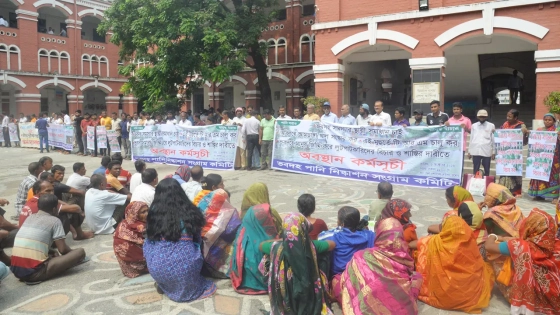 ভবদহ ও তৎসংলগ্ন বিল এলাকার জলাবদ্ধতা দূরীকরণসহ বিভিন্ন দাবিতে যশোর কালেক্টরেট ভবনের (ডিসি অফিস) সামনে অবস্থান কর্মসূচি নিয়েছেন জেলার জলমগ্ন এলাকার বাসিন্দারা।