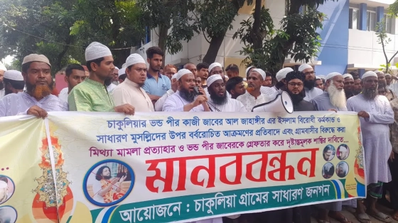 ঢাকার সাভারে এলাকাবাসী ও স্থানীয় মুসল্লিদের বিরুদ্ধে চাকুলিয়ার কথিত পীর কাজী জাবের আল জাহাঙ্গীরের করা হয়রানিমূলক মামলার প্রতিবাদে মানববন্ধন অনুষ্ঠিত হয়েছে।