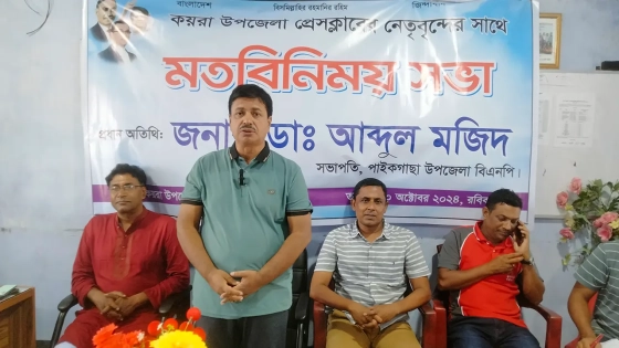 কয়রা উপজেলা প্রেস ক্লাবের সভাপতি মো. শরিফুল আলমের সভাপতিত্বে মতবিনিময় সভায় প্রধান অতিথির বক্তব্য দেন পাইকগাছা উপজেলা বিএনপির সভাপতি ডা. আব্দুল মজিদ। প্রেস ক্লাবের সাধারণ সম্পাদক মো. রিয়াছাদ আলীর পরিচালনায় মতবিনিময় সভায় আরও বক্তব্য দেন পাইকগাছা উপজেলা বিএনপির ভারপ্রাপ্ত সাধারণ সম্পাদক তুষার কান্তি মণ্ডল, সাংগঠনিক সম্পাদক আবুল হোসেন, যুবদল নেতা হুরায়রা বাদশা, সাংবাদিক মোস্তফা শফিকুল ইসলাম, আলহাজ সদর উদ্দিন আহমেদ, শেখ মনিরুজ্জামান মনু, শেখ কওছার আলম, এসএম নুরুল আমিন নাহিন, জিএম নজরুল ইসলাম, শহিদুল্যাহ শাহিন, সাইদুল ইসলাম, গ্রীরেন্দ্রনাথ মণ্ডল, শেখ জাহাঙ্গীর কবির টুলু, গোলাম রব্বানী, ফরহাদ হোসেন প্রমুখ।