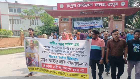 রোববার (৩ নভেম্বর) দুপুরে রংপুর মেডিকেল কলেজ ক্যাম্পাসে বিক্ষোভ মিছিল ও সমাবেশ করেছে হাসপাতালের চিকিৎসক-শিক্ষার্থী, কর্মকর্তা ও কর্মচারী।