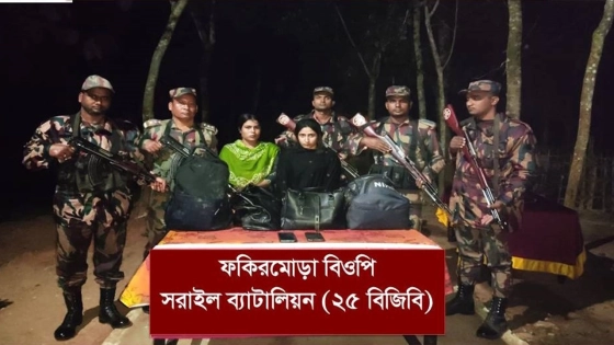 ব্রাহ্মণবাড়িয়ার আখাউড়ায় সীমান্ত এলাকা থেকে অবৈধভাবে ভারত থেকে ফেরার পথে দুই নারীকে আটক করেছে বর্ডার গার্ড বাংলাদেশ (বিজিবি)।