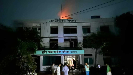 কিশোরগঞ্জের স্থানীয় সরকার প্রকৌশল (এলজিইডি) ভবনে অগ্নিকাণ্ড ঘটেছে। শনিবার (১২ আগস্ট) রাত ২টার দিকে রেলওয়ে স্টেশনের কাছে ওই অফিসে আগুন লাগে। খবর পেয়ে ফায়ার সার্ভিস ২ ঘণ্টা চেষ্টা চালিয়ে ভোর ৪টার দিকে আগুন নিয়ন্ত্রণে আনে।