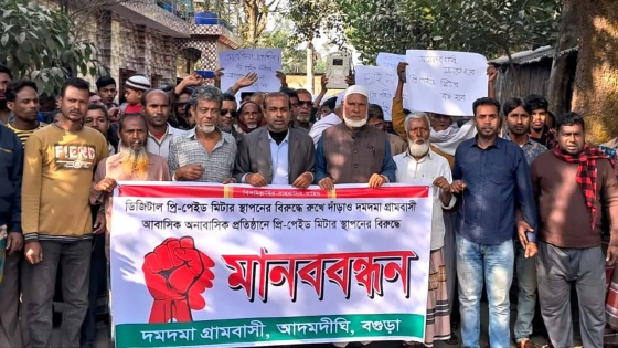 বগুড়ার আদমদীঘির সান্তাহারে ডিজিটাল প্রিপেইড মিটার স্থাপনের প্রতিবাদে মানববন্ধন করেছেন গ্রামবাসী। সোমবার (০৬ জানুয়ারি) বেলা ১১টায় উপজেলার সান্তাহার ইউপির দমদমা গ্রামে সাবেক ইউপি সদস্য মারুফ-উল হাসান খান শিপলুর নেতৃত্বে ঘণ্টাব্যাপী মানববন্ধন কর্মসূচি পালন করা হয়।