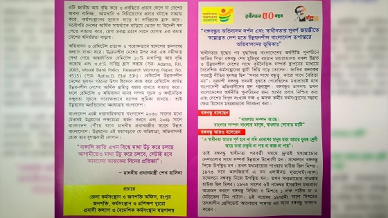 জেলা কর্মসংস্থান ও জনশক্তি অফিসের বিতরণ করা লিফলেটে দেখা যায়, বঙ্গবন্ধুর অভিবাসন দর্শন ও স্বাধীনতার সুবর্ণজয়ন্তীতে ‘স্বল্পোন্নত দেশ থেকে উন্নয়নশীল বাংলাদেশে রূপান্তরে অবিশ্বাসনের ভূমিকা’ শীর্ষক একটি লেখা, যাতে সাবেক শেখ হাসিনার আমলের নানা কর্মকাণ্ডের বিবরণ। এ ছাড়া লিফলেটের শেষে শেখ হাসিনার একটি বাণী ছাপা হয়।