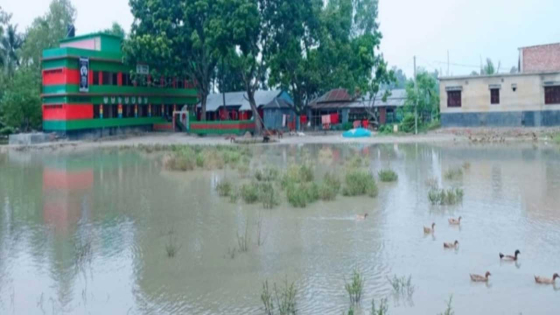সিরাজগঞ্জের রায়গঞ্জে জলাবদ্ধতার কারণে স্কুলে যেতে পারছে না ধুবিল ইউনিয়নের ৩ নম্বর মালতিনগর সরকারি প্রাথমিক বিদ্যালয়ের শিক্ষক ও শিক্ষার্থীরা। সড়ক থেকে স্কুলের মাঠ নিচু হওয়ায় বৃষ্টির পানি নিষ্কাশনের কোনো ব্যবস্থানা না থাকায় সামান্য বৃষ্টিতেই সৃষ্টি হয় জলাবদ্ধতা। স্কুলটির একপাশে পুকুর আর আরেক পাশে আবাদি জমি থাকায় থইথই করছে পানি।