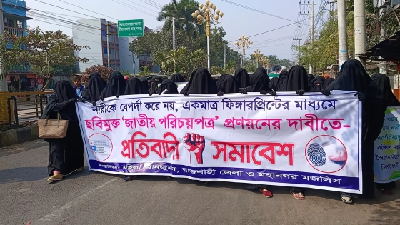 ছবি তুলে নয়, শুধু ফিঙারপ্রিন্টের মাধ্যমে ছবিমুক্ত জাতীয় পরিচয়পত্র বা এনআইডি দেওয়ার দাবিতে রাজশাহীতে সমাবেশ করেছেন পর্দানশীন নারীরা। মহিলা আনজুমানের রাজশাহী জেলা ও মহানগর মজলিসের ব্যানারে বুধবার (০৫ ফেব্রুয়ারি) দুপুরে আঞ্চলিক নির্বাচন কর্মকর্তার কার্যালয়ের সামনে এ কর্মসূচি পালিত হয়। সমাবেশ শেষে একটি বিক্ষোভ মিছিলও বের করেন তারা। পরে জেলা নির্বাচন কর্মকর্তার মাধ্যমে প্রধান নির্বাচন কমিশনার এবং জেলা ও বিভাগীয় শিক্ষা কর্মকর্তাকে স্মারকলিপি দেওয়া হয়।