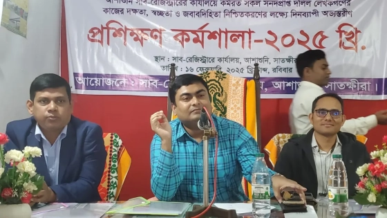 সাতক্ষীরার আশাশুনি সাব-রেজিস্ট্রার কার্যালয়ের অধীনে লাইসেন্স প্রাপ্ত দলিল লেখকদের কাজের দক্ষতা, স্বচ্ছতা ও জবাবদিহিতা নিশ্চিত করণের লক্ষ্যে দিনব্যাপী অভ্যন্তরীণ প্রশিক্ষণ কর্মশালা ২০২৫ অনুষ্ঠিত হয়েছে।