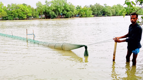 খুলনার পাইকগাছায় ভরা বর্ষা মৌসুমে উলুবুনিয়া নদীতে চায়না দুয়ারি বা চায়না জাল ব্যবহার করে মাছ ধরা হচ্ছে।