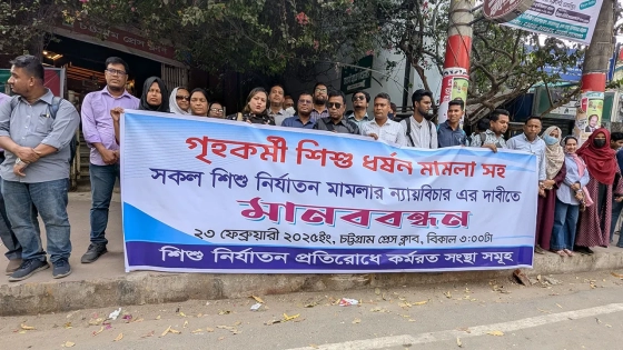 গৃহকর্মী শিশুদের প্রতি সহিংসতা ও নির্যাতনের বিরুদ্ধে সোচ্চার ভূমিকা তৈরিতে চট্টগ্রামে মানববন্ধন অনুষ্ঠিত হয়েছে। রোববার (২৩ ফেব্রুয়ারি) চট্টগ্রাম প্রেস ক্লাব প্রাঙ্গণে শিশু নির্যাতন প্রতিরোধে কর্মরত সংস্থাগুলো এ মানববন্ধনের আয়োজন করে।