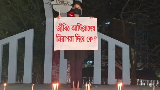 এসময় ‘জীবিত আছিয়াদের নিরাপত্তা দেবে কে?’ লেখা প্লাকার্ড হাতে তাকে একাই মুখের কালো কাপড় বেঁধে প্রায় ১ ঘণ্টা দাঁড়িয়ে থাকতে দেখা যায়। এসময় তার চারপাশে মোমবাতি জ্বালানো ছিল।