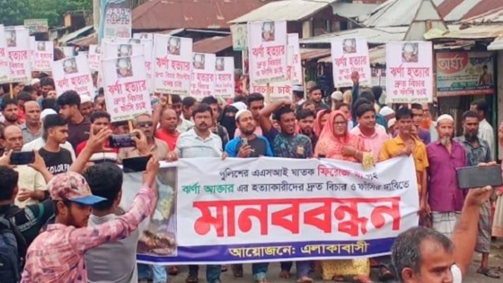 গৃহবধূ ঝর্ণা হত্যাকারীদের দ্রুত বিচার ও ফাঁসির দাবিতে নেত্রকোনার সদর উপজেলার বাংলা বাজারে এলাকাবাসী মানববন্ধন কর্মসূচির আয়োজন করে। এতে সর্বস্তরের মানুষসহ নিহতের সন্তান ও স্বামী অংশ নিয়ে ন্যায় বিচারের দাবি তুলে ধরেন। বৃহস্পতিবার আয়োজিত কর্মসূচিতে সতস্ফুর্তভাবে সবাই অংশ নেন।
