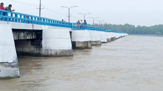 নীলফামারী তিস্তা ব্যারেজ পয়েন্টে উজানের পাহাড়ি ঢল ও ভারি বর্ষণের কারণে তিস্তা নদীর পানি বৃদ্ধি পেয়ে বিপৎসীমার ১১ সেন্টিমিটার ওপর দিয়ে প্রবাহিত হচ্ছে।
