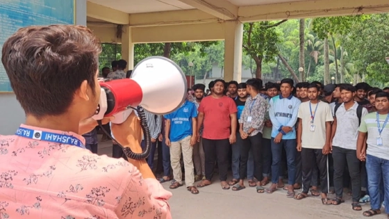 রাজশাহী পলিটেকনিক ইনস্টিটিউটে ছয় দফা দাবি আদায়ে ৯ দিন আগে শিক্ষার্থীদের দেওয়া তালা এখনো খোলেনি। এ অবস্থায় দাবি আদায়ে শাটডাউন কর্মসূচির অংশ হিসেবে ক্যাম্পাসে বিক্ষোভ করেছেন শিক্ষার্থীরা। এ সময় তারা দাবি আদায়ে নানা স্লোগান দেন।