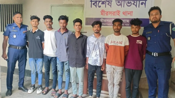 গ্রেপ্তাররা হলেন- মিরসরাই পৌরসভার বটতলা এলাকার জাহাঙ্গীর আলমের ছেলে ওয়াছি আলম শান্ত (১৯), মিঠানালা ইউনিয়নের রহমতাবাদ গ্রামের দিদারুল আলমের ছেলে মোহাম্মদ সবুজ (২০), খৈয়াছড়া ইউনিয়নের বাদামতলী এলাকার কবির হোসেনের ছেলে আরিফুল ইসলাম (১৯), মিরসরাই পৌরসভার তারাকাটিয়া গ্রামের হেলাল উদ্দিনের ছেলে সোহেল রানা (২০), ইছাখালী ইউনিয়নের ইছাখালী গ্রামের মোহাম্মদ ইউসুফের ছেলে মোহাম্মদ হৃদয় (১৯), মিরসরাই পৌরসভার পশ্চিম মিরসরাই এলাকার শামসুল হকের ছেলে তারিকুল ইসলাম রিফাত (১৯), নোয়াখালী জেলার সেনবাগ থানার জমিদারহাট এলাকার এমরান হোসেনের ছেলে রিয়াজ হোসেন (১৯)।