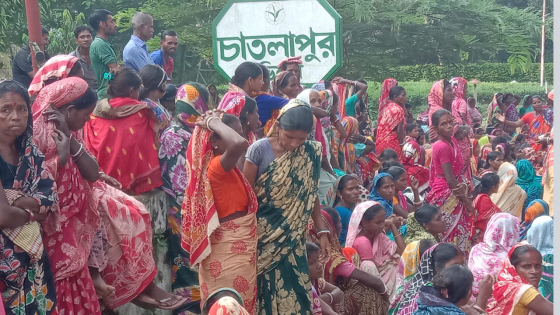 ১৮ কেজি পাতি উত্তোলনের পরিবর্তে ২০ কেজিতে নিরিখ করার প্রতিবাদে মৌলভীবাজারের কুলাউড়া উপজেলার চাতলাপুর চা বাগানে বিক্ষোভে নারী শ্রমিকরা।