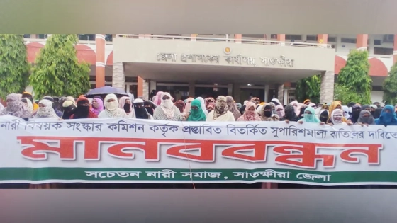 সাতক্ষীরায় সচেতন নারী সমাজের আয়োজিত মানববন্ধনে বক্তারা বলেছেন, নারীবিষয়ক সংস্কার কমিশনের জমা যেসব প্রস্তাবনা সরাসরি কোরআনের বিধানের সঙ্গে সাংঘর্ষিক তা অবিলম্বে বাতিল করতে হবে। নারী কমিশনের এই সংস্কার প্রস্তাব প্রমাণ করে, এটা পতিত ফ্যাসিবাদ ও স্বৈরাচারের পক্ষের একটি বিশেষ গোষ্ঠীর এজেন্ডা বাস্তবায়নের দলিল! সুতরাং এ প্রস্তাবনা শুধু বাতিলই নয়, পুরো ‘নারী বিষয়ক সংস্কার কমিশন’ বাতিল করতে হবে।