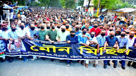 নজরুল ইসলাম খানের নেতৃত্বে বিএনপির নেতাকর্মীরা মুখে কালো কাপড় বেঁধে কালো ব্যানার নিয়ে কাজীর দেউরি নুর আহম্মেদ সড়ক থেকে মৌন মিছিল শুরু করে নেভাল মোড়, লাভ লেইন হয়ে কাজীর দেউরি মোড় হয়ে পুনরায় নাসিমন ভবনস্থ দলীয় কার্যালয়ের সামনে এসে মিছিল শেষ হয়। চট্টগ্রাম মহানগর বিএনপির আহ্বায়ক ডা. শাহাদাত হোসেনের সভাপতিত্বে ও যুগ্ম আহ্বায়ক ইয়াছিন চৌধুরী লিটনের পরিচালনায় সমাবেশে প্রধান বক্তার বক্তব্য রাখেন কেন্দ্রীয় বিএনপির সাংগঠনিক সম্পাদক মাহবুবের রহমান শামীম।