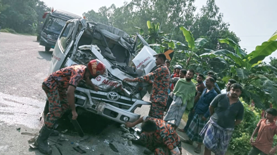 ঘোড়াঘাট ফায়ার সার্ভিসের স্টেশন ইনচার্জ নিরঞ্জন সরকার বলেন, ‘মহাসড়কের পাশে দিনাজপুরমুখী একটি ট্রাক দাঁড়িয়ে ছিল। লাশবাহী গাড়িটি নুরজাহানপুর নামক স্থানে পৌঁছালে থেমে থাকা ট্রাকে পেছন থেকে ধাক্কা দেয়। লাশবাহী গাড়িতে একজন বৃদ্ধ নারীর মরদেহ ছিল।’