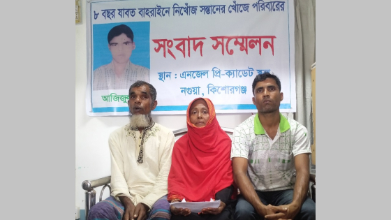 কিশোরগঞ্জের পাকুন্দিয়া উপজেলার চরকাওনা উত্তরপাড়া গ্রামের আজিজুল হক (২৬) পরিবারের অভাব অনটন মুছতে আট বছর আগে ভিটে-মাটি বিক্রি করে মধ্যপ্রাচ্যের দেশ বাহরাইনে পরিচ্ছন্নতা কর্মী হিসেবে পাড়ি জমান। সেখানে পৌঁছার পর ২২ দিন পরিবারের সদস্যদের সঙ্গে যোগাযোগ রাখেন। এরপর থেকে আর খোঁজ মিলছে না আজিজুলের।
