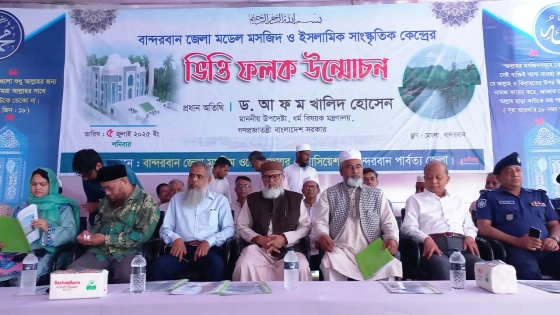 এর আগে ড. আ ফ ম খালিদ হোসেন বান্দরবান সদরের মেঘলা পর্যটন কেন্দ্রের পাশে প্রধান অতিথি হিসেবে উপস্থিত থেকে জেলা মডেল মসজিদ ও ইসলামিক সাংস্কৃতিক কেন্দ্রের ভিত্তিফলক উন্মোচনের উদ্বোধন করেন।