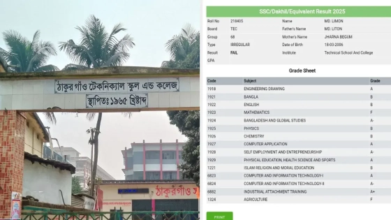 নাজমুল জানায়, ২০২৪ সালে কারিগরি শিক্ষাবোর্ডের অধীনে ঠাকুরগাঁও টেকনিক্যাল স্কুল অ্যান্ড কলেজ থেকে এসএসসি পরীক্ষায় অংশ নিয়ে গণিত বিষয়ে ফেল করি। ২০২৫ সালে ফের ফরম ফিলআপ করে গণিত বিষয়ে পরীক্ষায় অংশ নেওয়ার পর এখন ফলাফলে গণিতের সঙ্গে সঙ্গে কৃষি ও ট্রেড-২ মিলে ৩ বিষয়ে ফেল আসছে। প্রতিষ্ঠানের প্রধানকে অবগত করার পরও কোনো সমাধান হচ্ছে না।