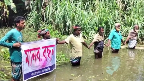 রোববার (৩১ আগস্ট) দুপুরে এবার সেই ডুবন্ত সড়কের পানিতে নেমেই মানববন্ধন করে রাস্তার দাবি করেছেন গ্রামবাসী।
