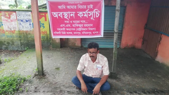 যশোরের মণিরামপুরে হাফিজুর রহমান নামের এক কলেজশিক্ষক নিজের বিচার দাবি করে ব্যানার ঝুলিয়ে অবস্থান কর্মসূচি পালন করেছেন। এ সংক্রান্ত একটি ছবি সামাজিক যোগাযোগমাধ্যমে ছড়িয়ে পড়েছে।