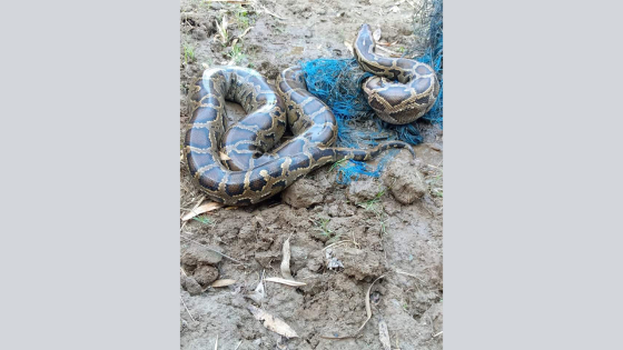 সিলেটের গোয়াইনঘাটে পুকুর পাড়ে জালে আটকে পড়া বিশাল আকৃতির একটি অজগর সাপ উদ্ধার করেছে থানা পুলিশ। রোববার (১০ সেপ্টেম্বর) সকালে গোয়াইনঘাট উপজেলার ১নং রুস্তমপুর ইউনিয়নের বীরমঙ্গল হাওর মাটিকাপা গ্রামে মোহাম্মদ আলীর পুকুরপাড়ে সাত ফুট লম্বা বিশাল আকৃতির অজগর সাপ ধরা পড়ে। খবর পেয়ে টিম নিয়ে ঘটনাস্থলে উপস্থিত হন গোয়াইনঘাট থানার এএসআই নয়ন রায়। পুলিশ ঘটনাস্থলে গিয়ে সাপটি উদ্ধার করে বন বিভাগের কর্তৃপক্ষের কাছে হস্তান্তর করে।