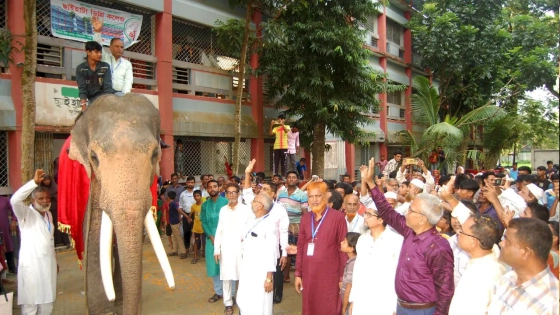 বগুড়ার সারিয়াকান্দি উপজেলার ছাইহাটা ডিগ্রি কলেজের অধ্যক্ষ আওরঙ্গজেব স্বপনকে হাতির পিঠে চড়ে রাজকীয় বিদায় জানাল কলেজ কর্তৃপক্ষ।