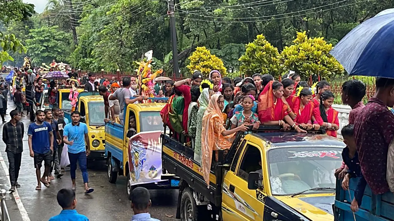 বৃষ্টির ফোঁটা ঝরতে থাকলেও ঢাক-ঢোল, কাশির সুর ও উলুধ্বনিতে মুখর হয় সিলেট নগরী। পূজা কমিটির নেতৃবৃন্দের সঙ্গে সাধারণ ভক্তরাও অংশ নেন শোভাযাত্রায়। রঙিন প্রতিমা কাঁধে নিয়ে ভক্তরা এগিয়ে যান বিসর্জন ঘাটের দিকে। নগরীর চৌহাট্টা, জিন্দাবাজার, দাঁড়িয়াপাড়া, পাঠানঠুলা, বাগবাড়িসহ বিভিন্ন এলাকার মণ্ডপ থেকে একে একে প্রতিমা আসা শুরু করে সুরমা নদীর তীরে।