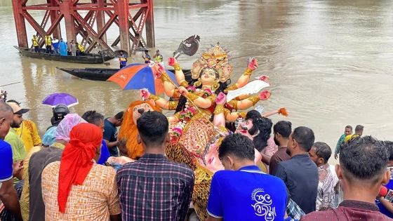 শারদীয় দুর্গোৎসবের মহাষষ্ঠী থেকে দশমী পর্যন্ত পাঁচ দিনব্যাপী চলে পূজা-অর্চনা, আনন্দ-উল্লাস ও ভক্তিমূলক পরিবেশ। সেই উৎসবের পর বৃহস্পতিবার (২ অক্টোবর) দুপুর থেকে শুরু হয় বিসর্জনের প্রস্তুতি। কিন্তু বিদায়ের দিন শহরজুড়ে নেমে আসে টানা বৃষ্টি। বৃষ্টিকে উপেক্ষা করে বিকেলে হাজারো ভক্ত-অনুরাগী ছুটে যান সুরমা নদীর তীর চাঁদনীঘাট বিসর্জন স্থলে।