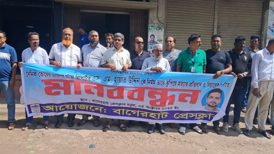 শনিবার (৪ অক্টোবর) দুপুরে বাগেরহাট প্রেস ক্লাবের আয়োজনে মানববন্ধনে শতাধিক সাংবাদিক অংশগ্রহণ করেন।
