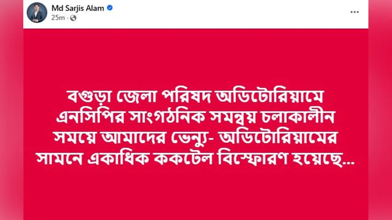 বগুড়ায় জাতীয় নাগরিক পার্টির (এনসিপি) মুখ্য সংগঠক (উত্তরাঞ্চল) সারজিস আলমের অনুষ্ঠানস্থলের সামনে একাধিক ককটেল বিস্ফোরণের ঘটনা ঘটে।