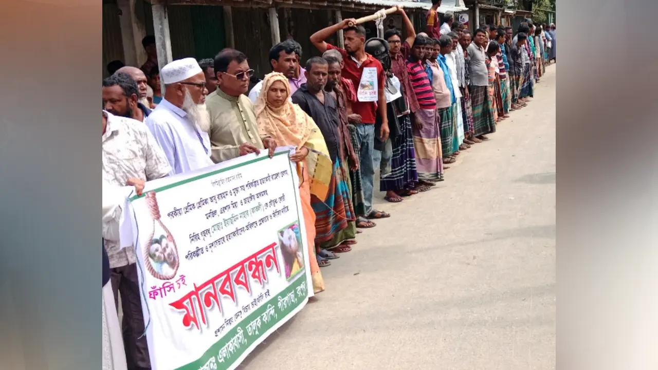 সোমবার (২৭ অক্টোবর) সকালে উপজেলার কান্দি ইউনিয়নের তালের হাট বাজারে এলাকাবাসীর আয়োজনে এ মানববন্ধন অনুষ্ঠিত হয়। এতে কান্দি ইউনিয়নের রাজনৈতিক দলের নেতৃবৃন্দ, তালুক কান্দি, তালের হাটসহ আশপাশের কয়েকটি গ্রামের শতাধিক মানুষ অংশ নেন।