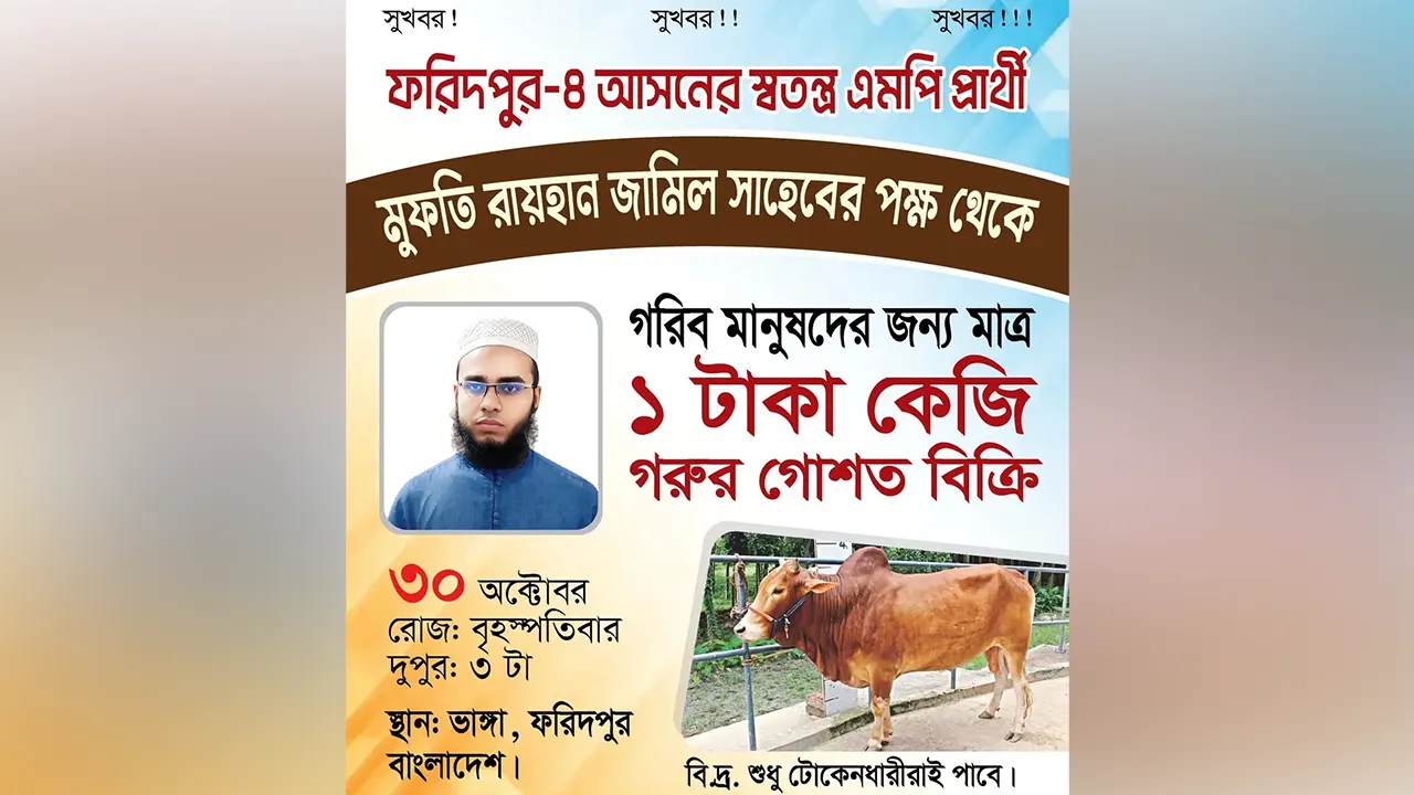 ১০ টাকায় ইলিশ বিক্রি করে আলোচনায় আসা ফরিদপুর-৪ (ভাঙ্গা-সদরপুর-চরভদ্রাসন) আসনের স্বতন্ত্র সংসদ সদস্য প্রার্থী সেই রায়হান জামিল এবার ১ টাকা কেজি গরুর মাংস বিতরণ করেছেন।