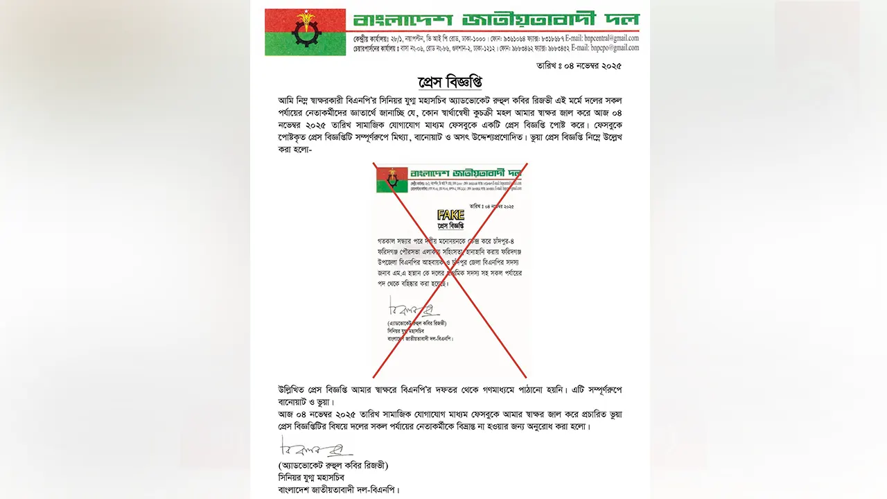 বিএনপির সিনিয়র যুগ্ম মহাসচিব অ্যাডভোকেট রুহুল কবির রিজভী স্বাক্ষরিত বিজ্ঞপ্তিটিতে জানানো হয়, সব পর্যায়ের নেতাকর্মীদের জ্ঞাতার্থে জানাচ্ছি যে, কোনো স্বার্থান্বেষী কুচক্রী মহল আমার স্বাক্ষর জাল করে সোমবার (০৪ নভেম্বর) সামাজিক যোগাযোগমাধ্যম ফেসবুকে একটি প্রেস বিজ্ঞপ্তি পোস্ট করে। ফেসবুকে পোস্টকৃত প্রেস বিজ্ঞপ্তিটি সম্পূর্ণরূপে মিথ্যা, বানোয়াট ও অসৎ উদ্দেশ্যপ্রণোদিত।