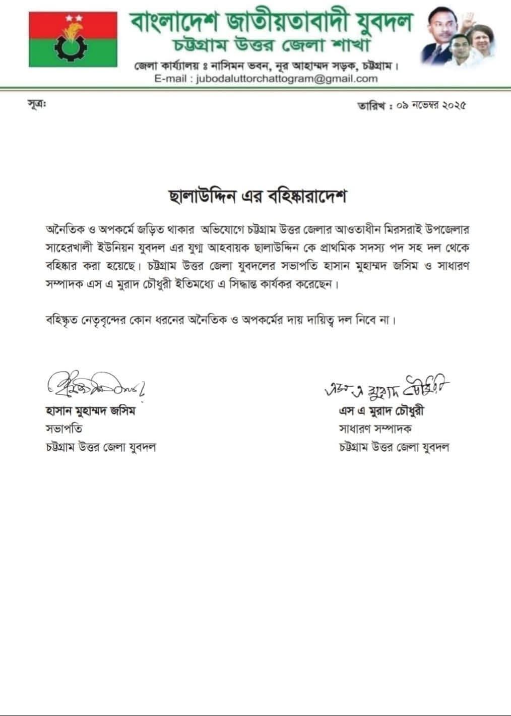 বিজ্ঞপ্তিতে উল্লেখ করা হয়, অনৈতিক ও অপকর্মে জড়িত থাকার অভিযোগে চট্টগ্রাম উত্তর জেলা আওতাধীন মিরসরাই উপজেলার সাহেরখালী ইউনিয়ন যুবদলের যুগ্ম আহ্বায়ক ছালাউদ্দিনকে প্রাথমিক সদস্য পদসহ দল থেকে থেকে বহিষ্কার করা হয়েছে। চট্টগ্রাম উত্তর জেলা যুবদলের সভাপতি হাসান মুহাম্মদ জসিম ও সাধারণ সম্পাদক এস এ মুরাদ চৌধুরী ইতোমধ্যে এ সিদ্ধান্ত কার্যকর করেছেন।