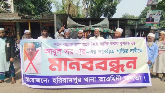 মানিকগঞ্জের হরিরামপুরে বিতর্কিত বাউল শিল্পী আবুল সরকারের ফাঁসির দাবিতে মানববন্ধন ও বিক্ষোভ মিছিল অনুষ্ঠিত হয়েছে।