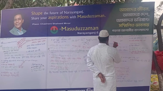 মঙ্গলবার (২ ডিসেম্বর) মাসুদুজ্জামানের এই ব্যতিক্রমী উদ্যোগের মাধ্যমে নির্বাচনী এলাকার সর্বস্তরের মানুষ তাদের দৈনন্দিন সমস্যা, প্রয়োজন, প্রত্যাশা এবং স্থানীয় উন্নয়ন সম্পর্কে মতামত লিখে দিচ্ছেন ওই ক্যানভাসে।