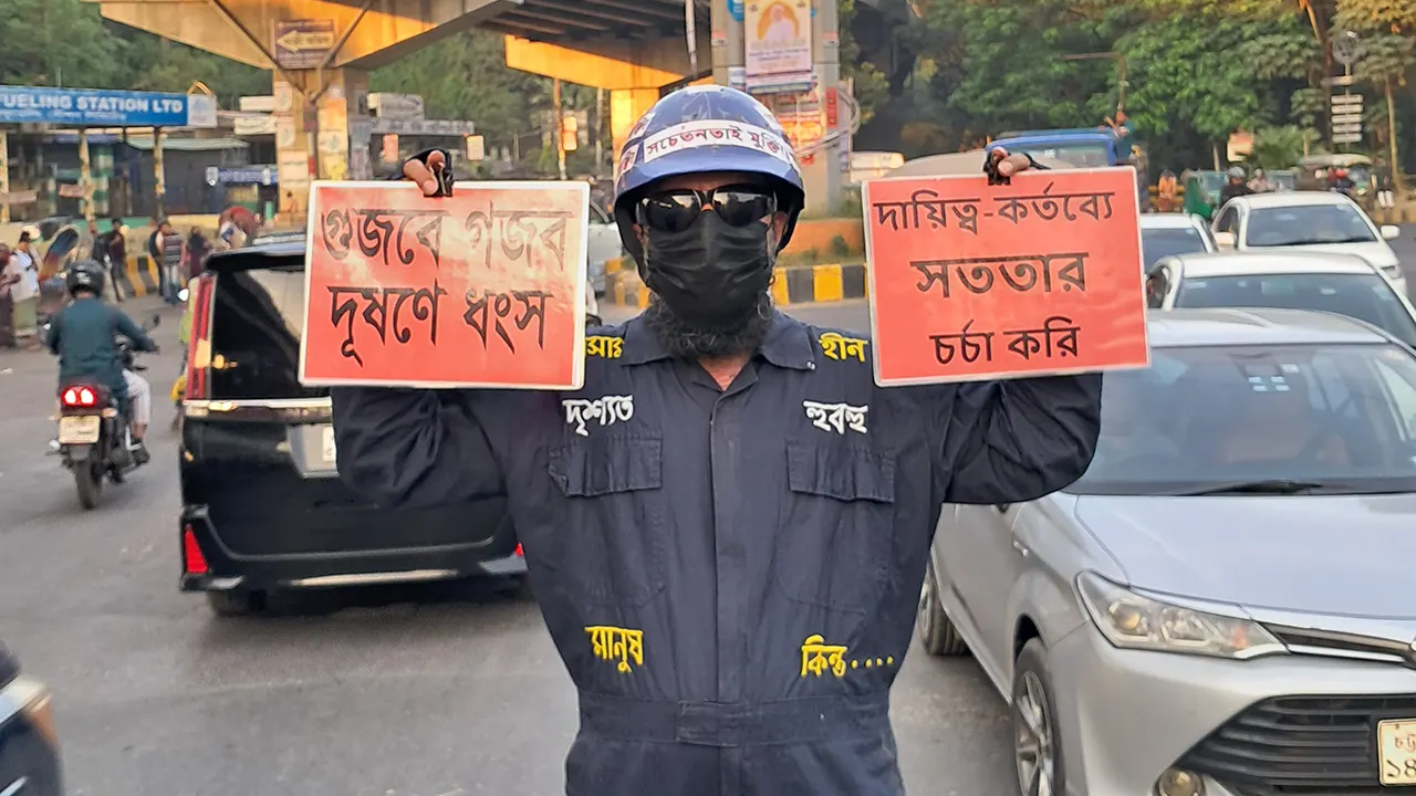 রোববার ভর দুপুর। চট্টগ্রাম নগরীর দেওয়ানহাট থেকে লালখান বাজারের পথে টাইগারপাস মোড়ে চোখ আটকে যায় এক অদ্ভুত দৃশ্যে। ব্যস্ত সড়কের মাঝের বিভাজকে দাঁড়িয়ে আছেন বিশেষ পোশাক পরা এক ব্যক্তি। মাথায় হেলমেট, হাতে দুটি প্ল্যাকার্ড। পোশাক, হেলমেট আর প্ল্যাকার্ড; সবকিছুতেই লেখা পরিবেশ দূষণবিরোধী নানা বার্তা। কাছে যেতেই স্পষ্ট হয় বিষয়টি। মানুষকে সচেতন করতেই তার এই ব্যতিক্রমী উদ্যোগ।