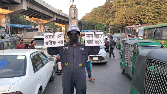 তার প্ল্যাকার্ডে লেখা—‘অযথা হর্ন-মাইক নয়’, ‘গুজবে গজব’, ‘দূষণে ধ্বংস’, ‘দায়িত্ব-কর্তব্যে সচেতনতার চর্চা করি’। হেলমেটে লেখা—‘সচেতনতাই মুক্তি’। আর ভিন্নধর্মী পোশাকে লেখা—‘আমার আজকের শপথ, আত্মসচেতনতাই মুক্তির পথ’।