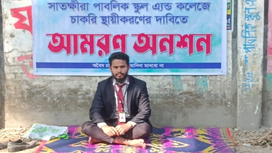 চাকরি স্থায়ীকরণের দাবিতে টানা ৪০ ঘণ্টা ধরে আমরণ অনশনে বসে আছেন সাতক্ষীরা পাবলিক স্কুল অ্যান্ড কলেজের ইংরেজির শিক্ষক আক্তারুল ইসলাম। কোনো নোটিশ ছাড়াই চাকরি থেকে অব্যাহতি দেওয়ার প্রতিবাদে রোববার (৭ ডিসেম্বর) সকাল সাড়ে ৯টা থেকে অনশন শুরু করেন তিনি।