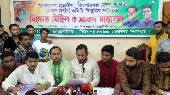 কিশোরগঞ্জ জেলা ছাত্রলীগের কমিটি বিলুপ্তির দাবিতে বিক্ষোভ মিছিল ও সংবাদ সম্মেলন করেছে জেলা ছাত্রলীগের একাংশের নেতাকর্মীরা। শনিবার (২৩ সেপ্টেম্বর) দুপুরে জেলা আওয়ামী লীগ কার্যালয়ে আয়োজিত সংবাদ সম্মেলনে লিখিত বক্তব্য পাঠ করেন জেলা ছাত্রলীগের সাংগঠনিক সম্পাদক লুৎফর রহমান নয়ন। পরে জেলা শহরে ছাত্রলীগের নেতাকর্মীরা বিক্ষোভ মিছিল করে।