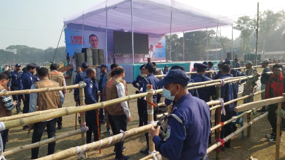 ময়মনসিংহ নগরীর সার্কিট হাউস মাঠে বিএনপি চেয়ারম্যান তারেক রহমানের সমাবেশস্থল নিশ্ছিদ্র নিরাপত্তায় ঢেকে রেখেছেন আইনশৃঙ্খলা বাহিনীর সদস্যরা।