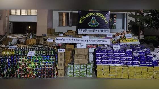 নারায়ণগঞ্জ সোনারগাঁয়ে কুরিয়ার সার্ভিসের আড়ালে ভারতীয় বিস্ফোরক ও চোরাচালান পণ্যের একটি বড় চালান আটক করেছে র্যাব-১১। এ ঘটনায় বিস্ফোরক ও বিভিন্ন ভোগ্যপণ্যের সঙ্গে একটি কাভার্ডভ্যান জব্দ ও দুজনকে গ্রেপ্তার করা হয়েছে।