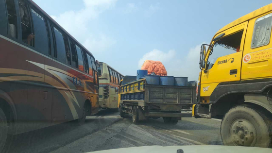 এদিকে যানজটের কারণে বিভিন্ন যানবাহনকে ঘণ্টার পর ঘণ্টা দাঁড়িয়ে থাকতে দেখা গেছে।