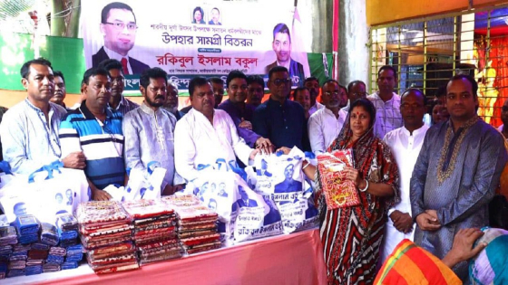 প্রধান অতিথি বিএনপির কেন্দ্রীয় ছাত্রবিষয়ক সম্পাদক রকিবুল ইসলাম বকুলের পক্ষে বিভিন্ন উপহারসামগ্রী স্থানীয় সনাতন ধর্মাবলম্বীদের হাতে তুলে দেন।