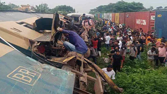 কিশোরগঞ্জের ভৈরবে কিশোরগঞ্জের ভৈরবে যাত্রীবাহী ট্রেন এগারসিন্ধু একটি মালবাহী ট্রেনকে পেছন থেকে ধাক্কা দিয়েছে। এ ঘটনায় এখন পর্যন্ত ১২ জনের মরদেহ উদ্ধার করা হয়েছে। আরও বহু হতাহতের আশঙ্কা করা হচ্ছে। দুর্ঘটনাস্থলে হতাহত ও নিখোঁজ স্বজনদের আহাজারি করতে দেখা গেছে।